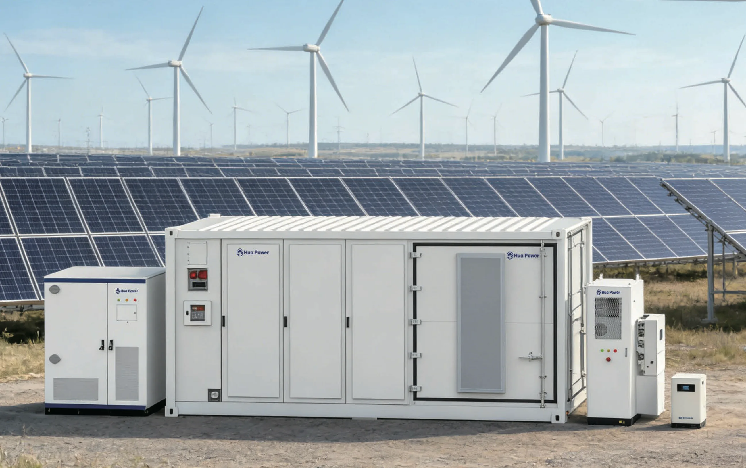 Hua Power battery storage systems span five major product lines — utility-scale container BESS, commercial & industrial cabinets, microgrid systems, and residential ESS — all powered by Grade A LFP batteries.